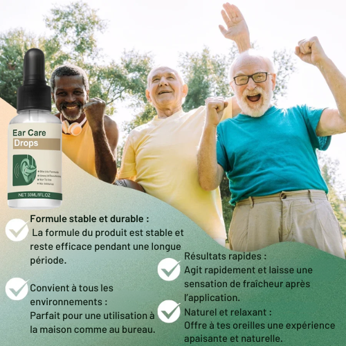 Chaque goutte contient un mélange précis d’ingrédients bioactifs conçus pour nourrir les nerfs auditifs et garder les conduits auriculaires clairs.